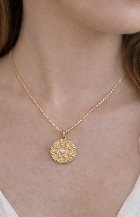 4. Circular Pendant: A delicate circle design showcasing a cluster of small white stones at the center. This pendant combines subtlety and sparkle, making it a versatile addition to your collection.